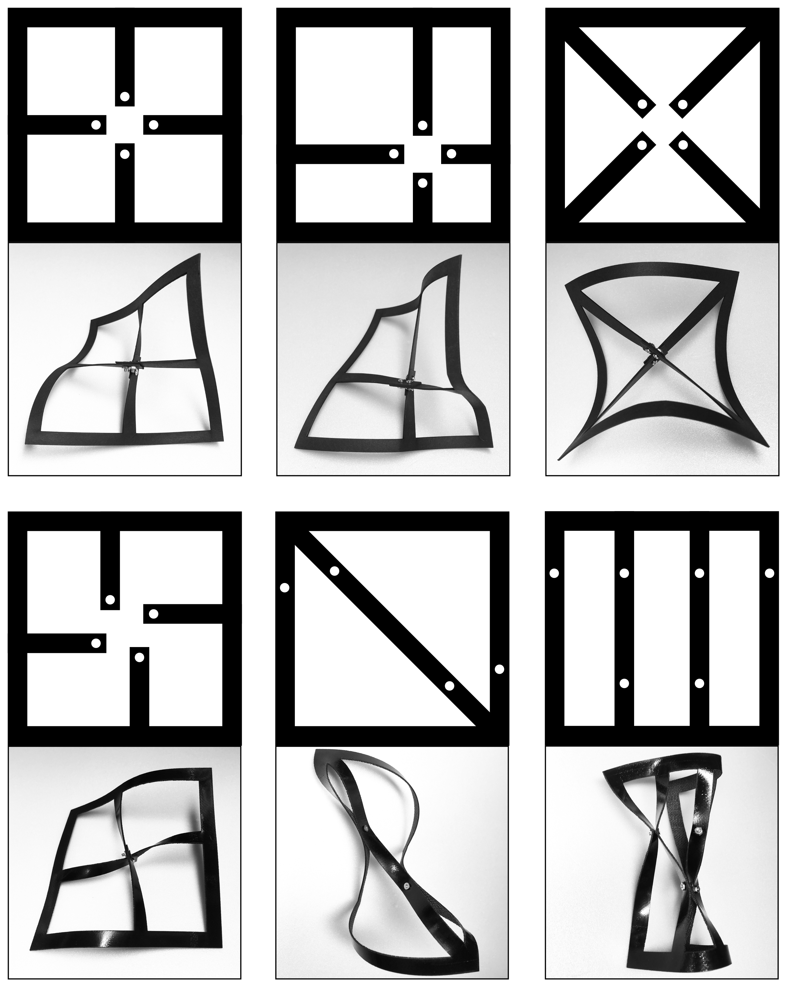 這是為布料造型所最早思考的手法。布料本身柔軟不易控制形態且不能自力,需要爲其增添骨骼才可以增强其可控性。這個手法是在布料上增添平面形狀的邊框骨架,然後連接預設的節點,就可以使布料產生從平面到立體的變形。并且整體結構具有了自立的强度。這一系列方形邊框的設計,也是張拉模塊造型手法的雛形。