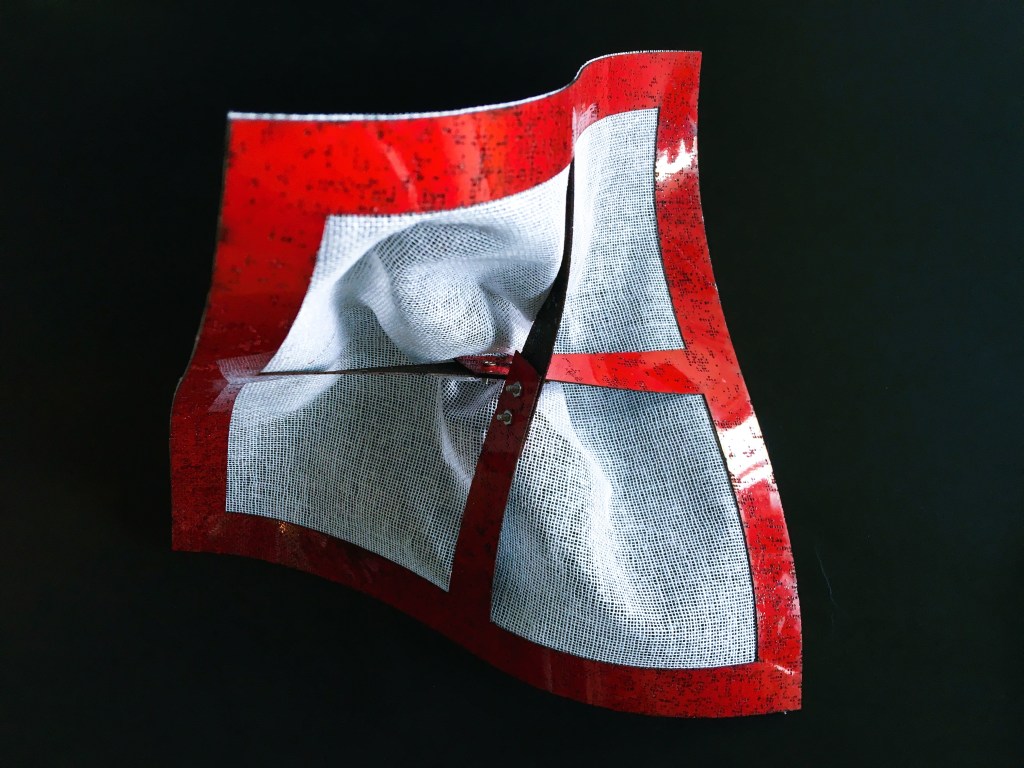 This is the earliest method developed for shaping fabric. Because fabric is soft, difficult to control, and unable to stand on its own, it requires an added skeletal structure to improve its controllability. In this approach, a planar frame is added to the fabric as a boundary “bone,” and by connecting predetermined nodes, the fabric can be deformed from a flat surface into a three-dimensional form. The overall structure also gains sufficient strength to stand independently. This series of square-frame designs later became the prototype for the Tension Module forming method.