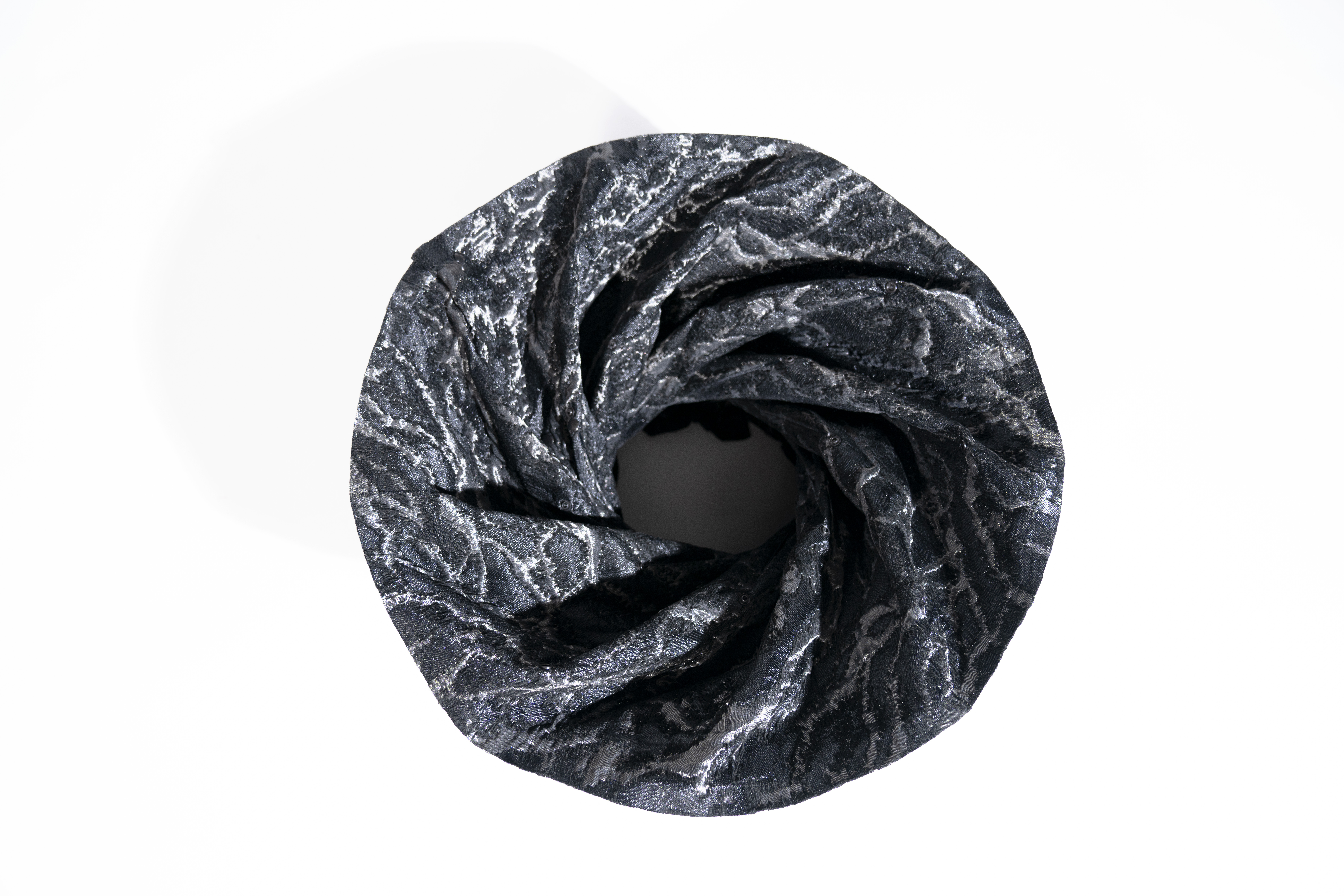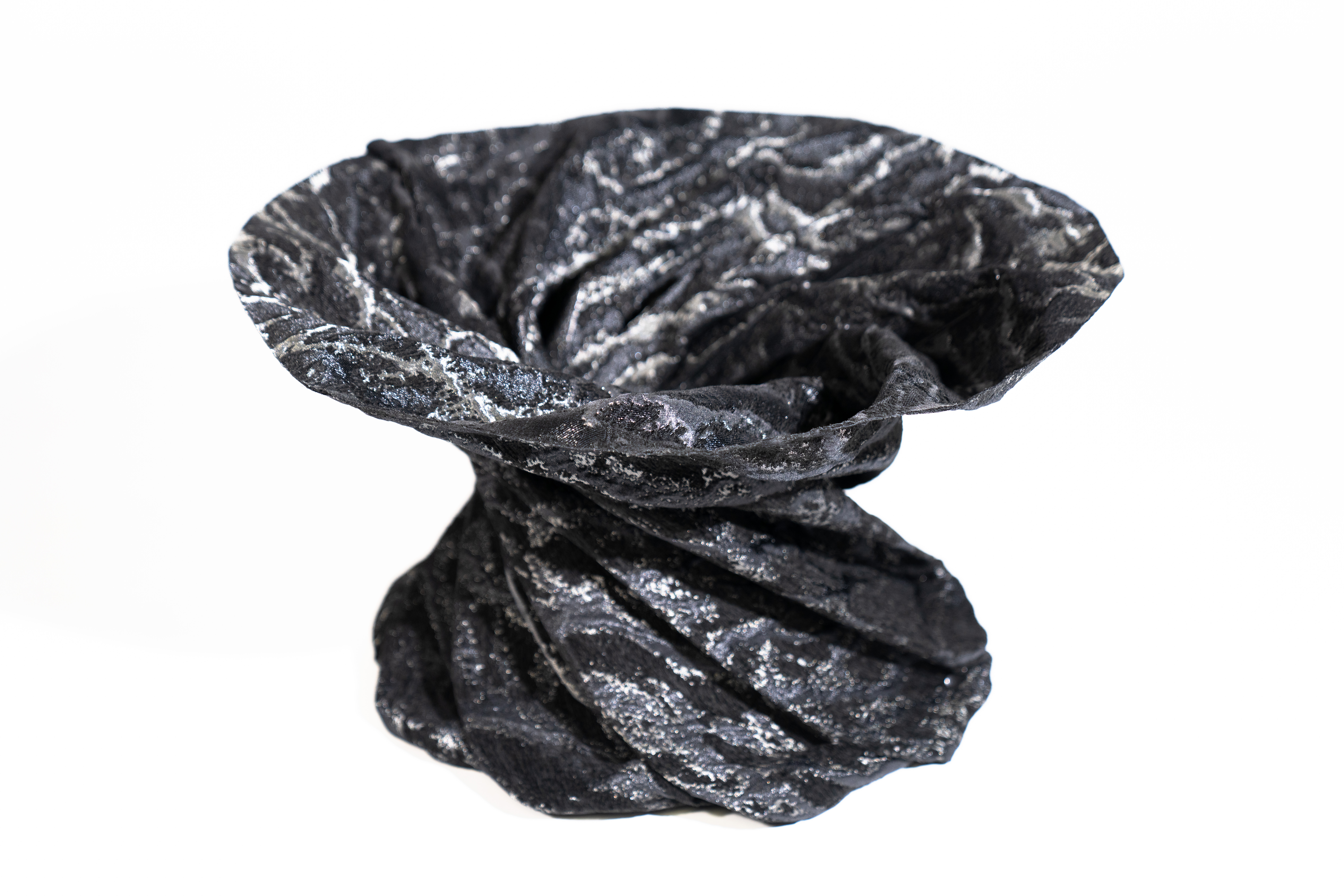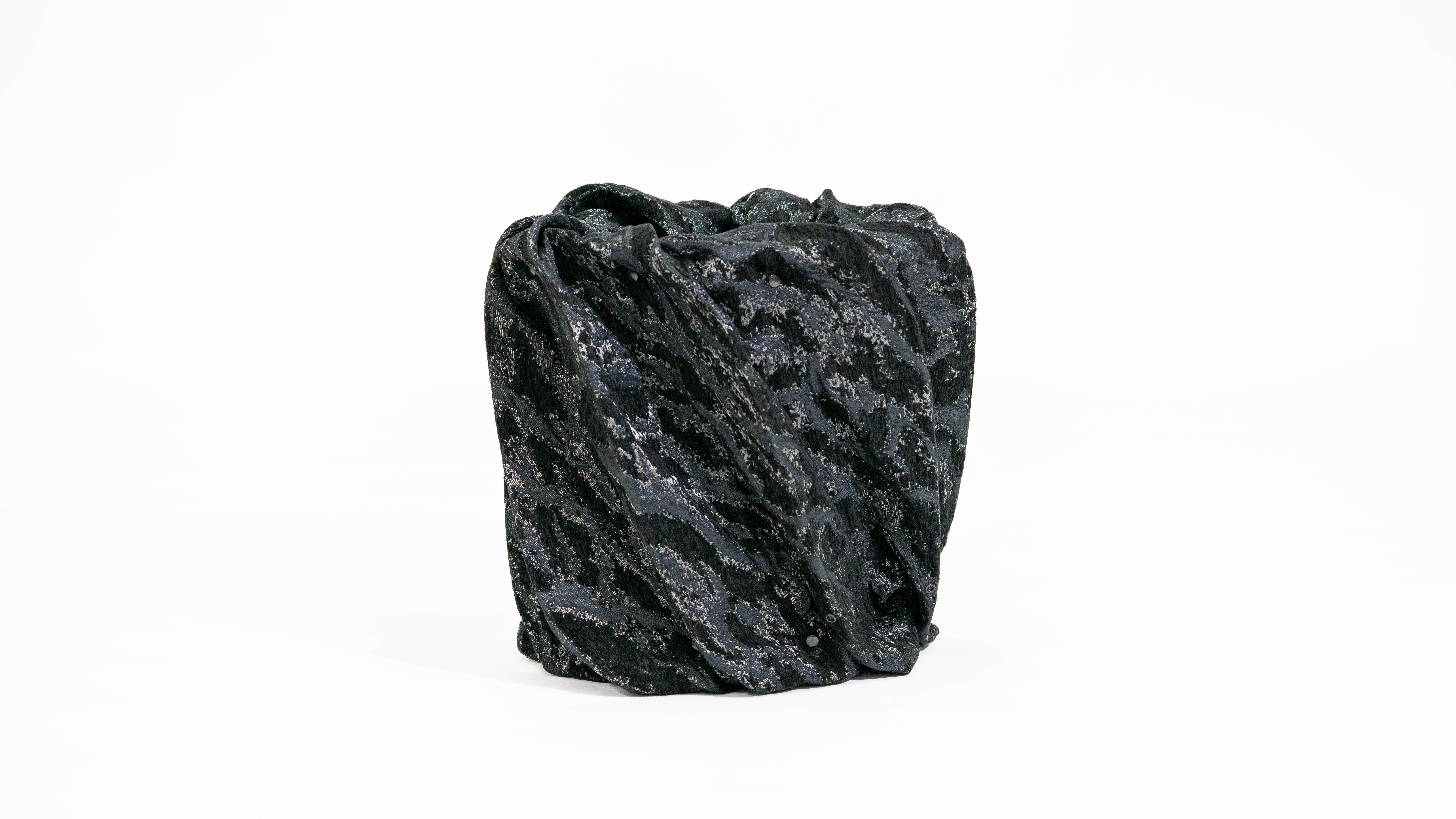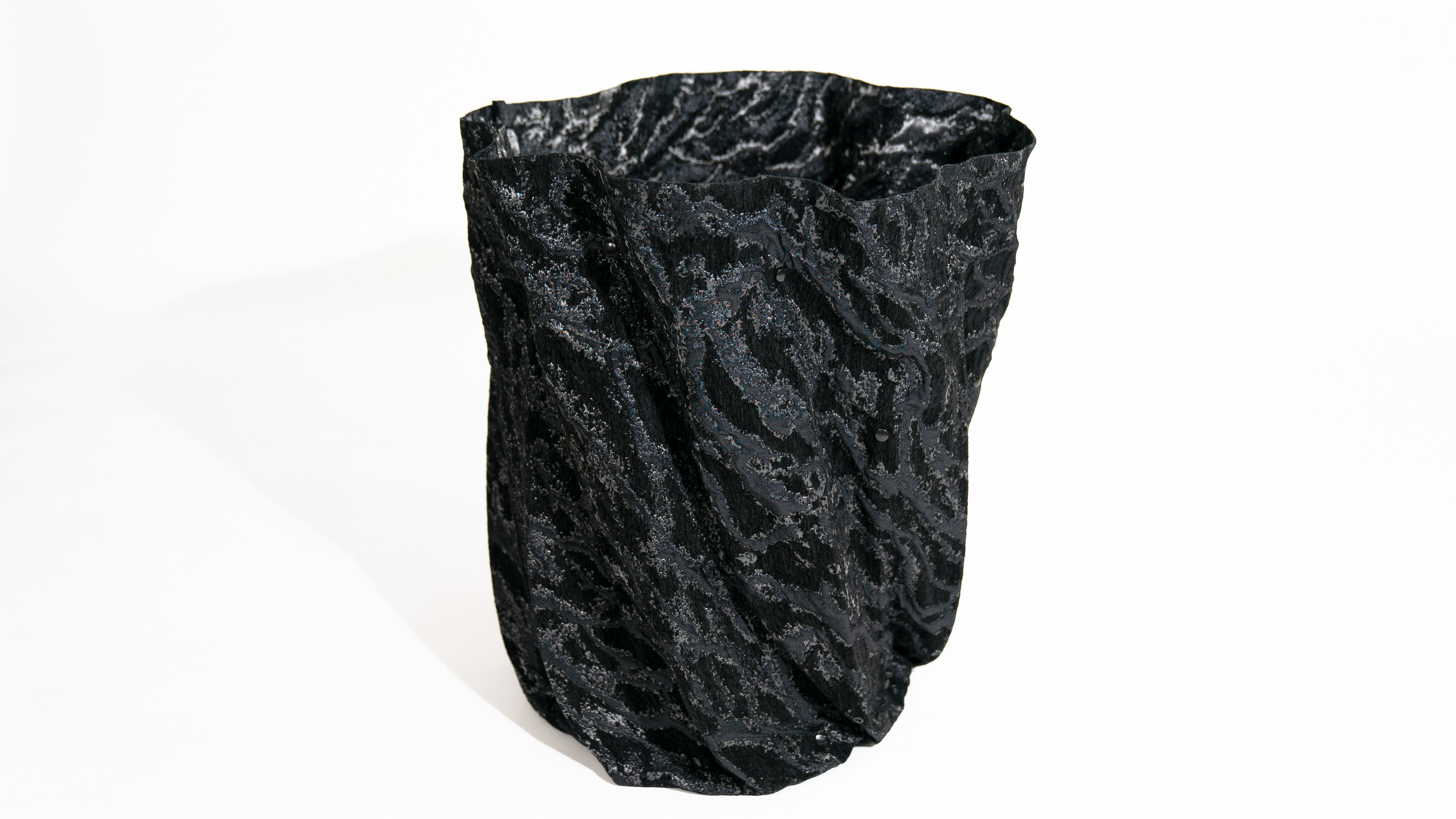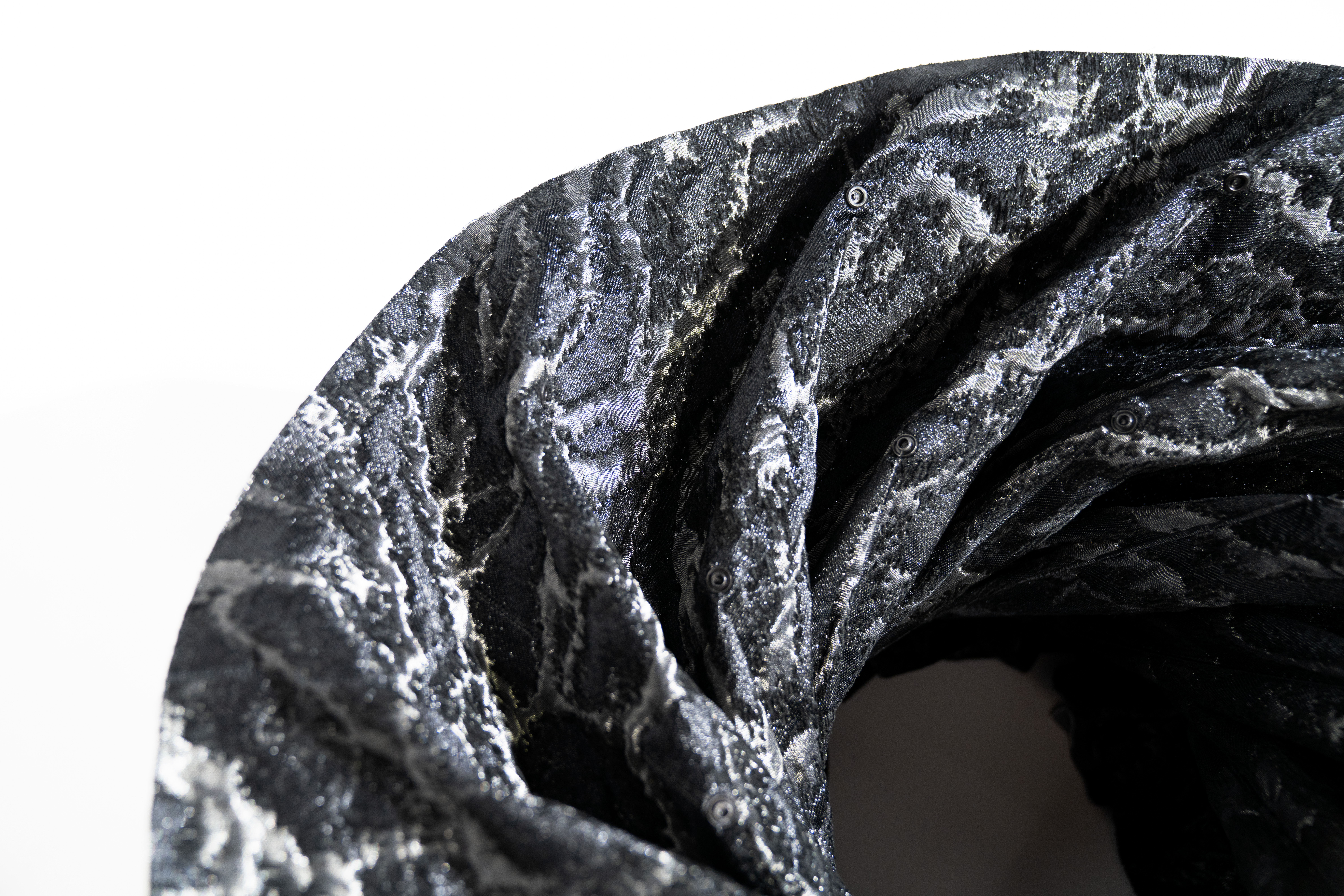 It is woven using thin carbon bars as wefts. The ends of these bars can be connected using snap buttons, allowing the textile to transition into three-dimensional forms which were designed through simulations.